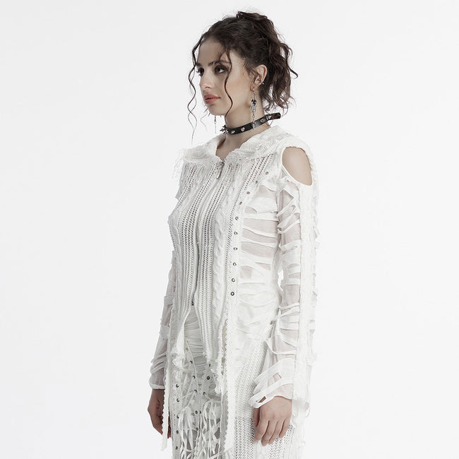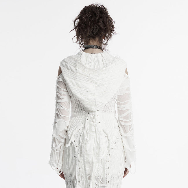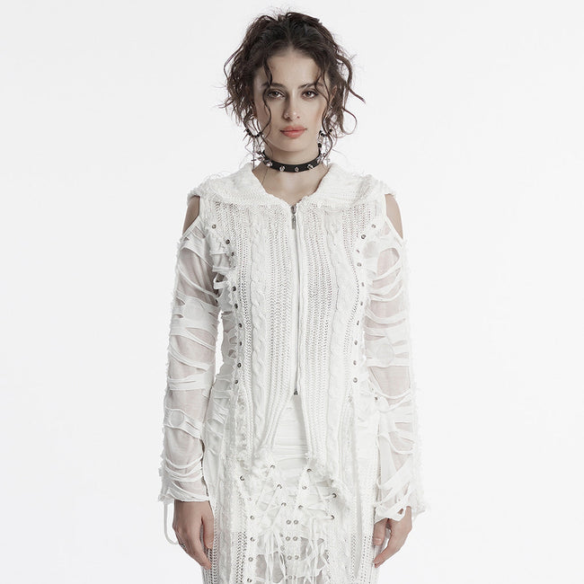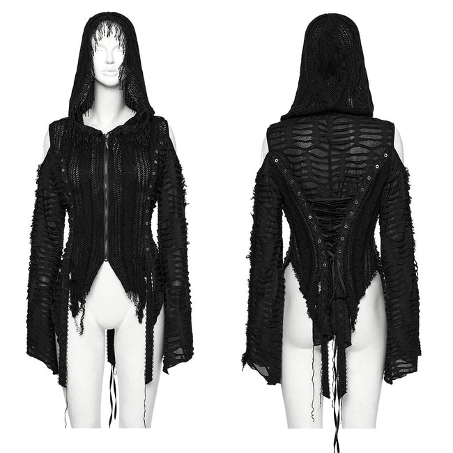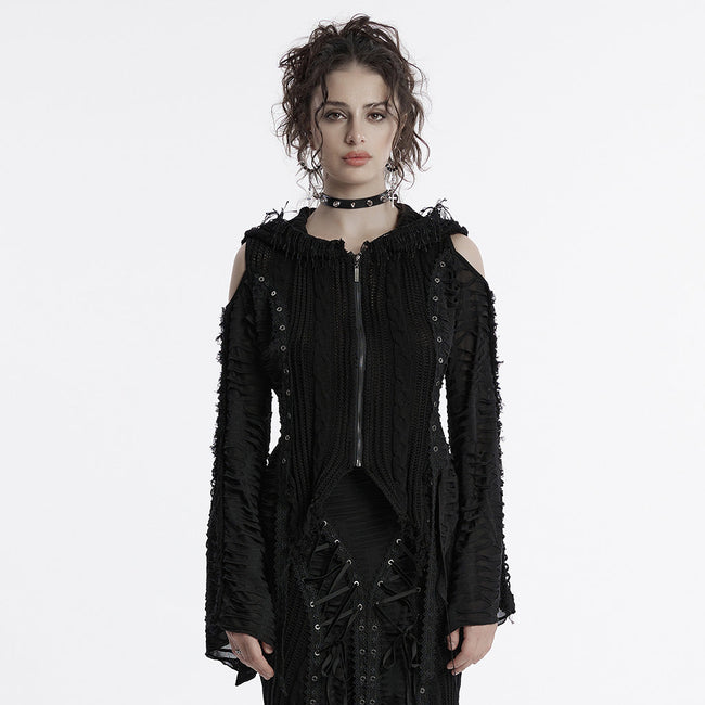 3. The brim of the hat is adorned with tassels and the frontmetal zipper and side eyelets add details. The sleeves and side waist are spliced with tattered fabriccreating an overall sense of decadent.